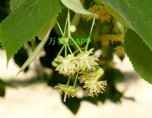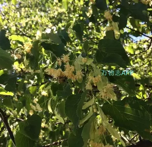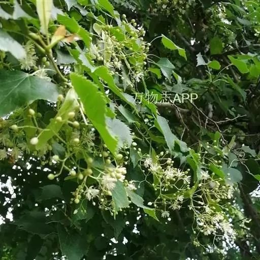 椴树 椴树(原变种),乔木,高20米,树皮灰色,直裂;小枝近秃净,顶芽无毛或有微毛。叶卵圆形,长7-14厘米,宽5.5-9厘米,先端短尖或渐尖,基部单侧心形或斜截形,上面无毛,下面初时有星状茸毛,以后变秃净,在脉腋有毛丛,干后灰色或褐绿色,侧脉6-7对,边缘上半部有疏而小的齿突;叶柄长3-5厘米,近秃净。聚伞花序长8-13厘米,无毛;花柄长7-9毫米;苞片狭窄倒披针形,长10-16厘米,宽1.5-2.5厘米,无柄,先端钝,基部圆形或楔形,上面通常无毛,下面有星状柔毛,下半部5-7厘米与花序柄合生;萼片长圆状披针形,长5毫米,被茸毛,内面有长茸毛;花瓣长7-8毫米;退化雄蕊长6-7毫米;雄蕊长5毫米;子房有毛,花柱长4-5毫米。果实球形,宽8-10毫米,无棱,有小突起,被星状茸毛。花期7月。