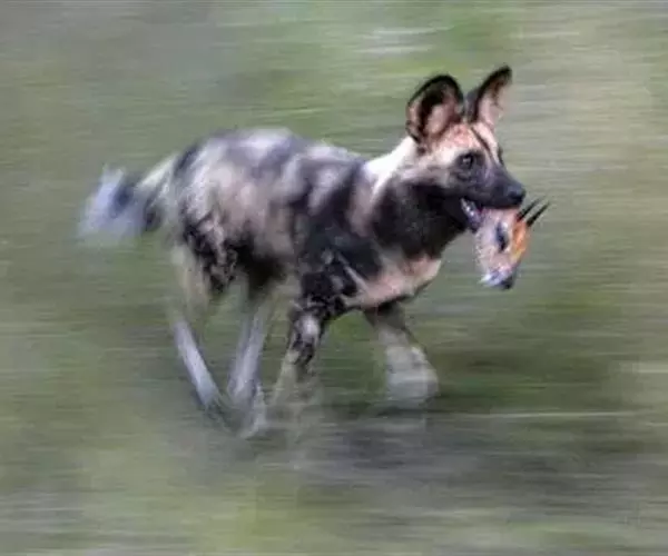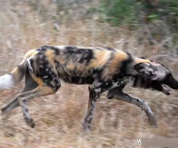 非洲野犬(学名:Lycaon pictus):体长100厘米,尾长30-45厘米,体重17-36千克。毛色较杂乱,包括黑色、黄色和白色等,每个个体毛色斑纹均不相同。前肢无爪。前臼齿较大,可磨碎大型骨头,类似鬣狗。群居,通过叫声进行定位。采取群体合作方式猎杀中型有蹄动物,追击时速可达45千米。全年可繁殖,多为雨季,每胎产2-19仔,通常10仔,幼仔一般在其他动物(比如土狼)的巢穴中出身,12-18个月性成熟。
