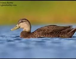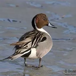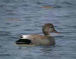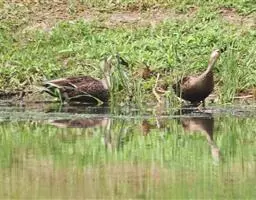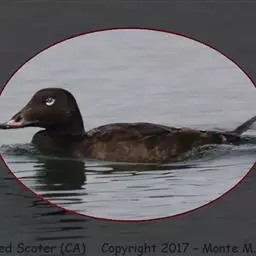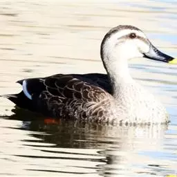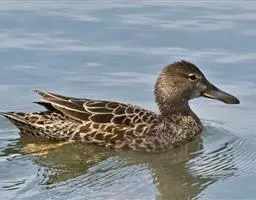 雌鸟头和项棕褐色,头顶和颈较暗,颏部有一三角形白色小斑,喉部亦杂有白色。上体暗褐色,腰和尾上覆羽黑褐色,背和肩具棕褐色羽缘。两翅同雄鸟,亦具宽阔的白色翼镜。上胸棕褐色,下胸灰白而杂以不明显的棕斑。上腹灰白色,下腹褐色,羽缘白色。两胁褐色,具棕色端斑,尾下覆羽白色。