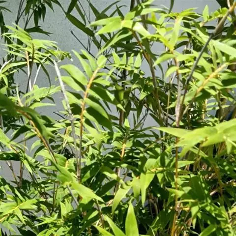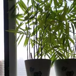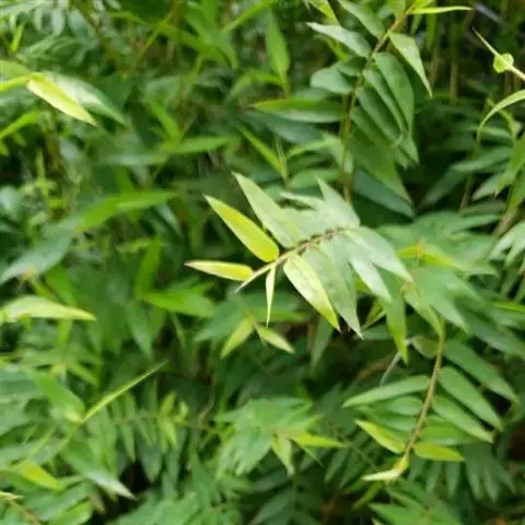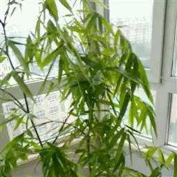 凤尾竹 Raeusch. ex Schult. ’Fernleaf’ R. A. Young)是禾本科,簕竹属孝顺竹的变种。植株较高大,杆高可达6米,竿中空,小枝稍下弯,下部挺直,绿色;竿壁稍薄;节处稍隆起,无毛;叶鞘无毛,纵肋稍隆起,背部具脊;叶耳肾形,边缘具波曲状细长繸毛;叶舌圆拱形,叶片线形,上表面无毛,下表面粉绿而密被短柔毛,小穗含小花,中间小花为两性;外稃两侧稍不对称,长圆状披针形,先端急尖;内稃线形,脊上被短纤毛,花药紫色,子房卵球形,羽毛状。成熟颖果未见。原产中国,华东、华南、西南以至台湾、香港均有栽培。凤尾竹喜温暖、湿润和阳光充足的环境,耐寒。宜土层深厚、肥沃、疏松的微酸性壤土。该种观赏价值较高,宜作庭院丛栽,也可作盆景植物。全草或根入药,味淡、微苦,性寒,有清热利湿、凉血止血、消肿解毒功效,可治痢疾、泄泻等多种病症。凤尾