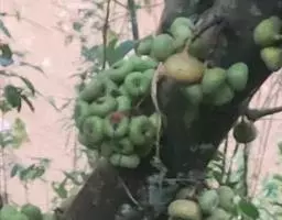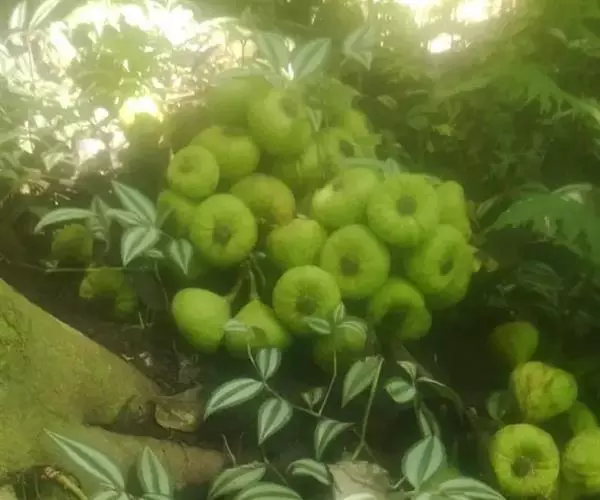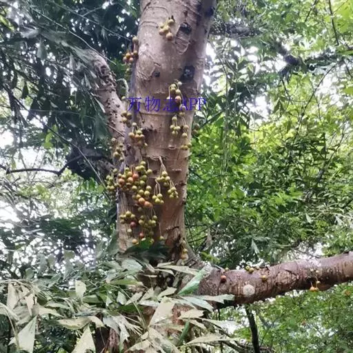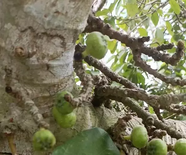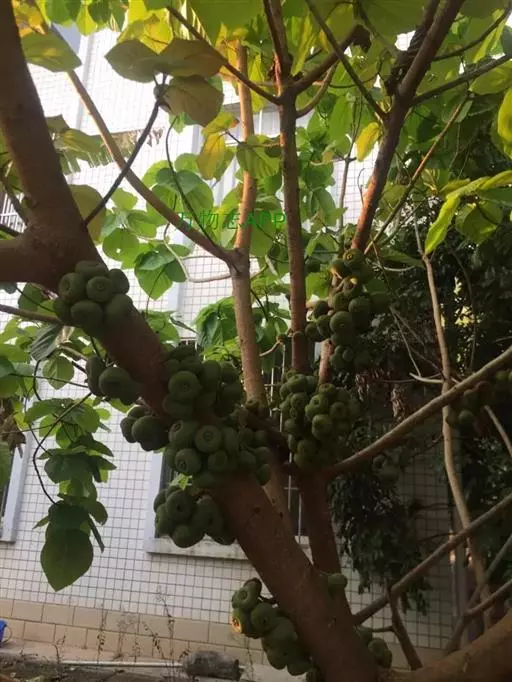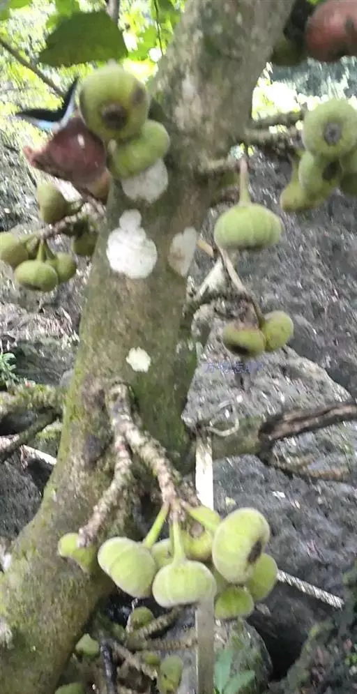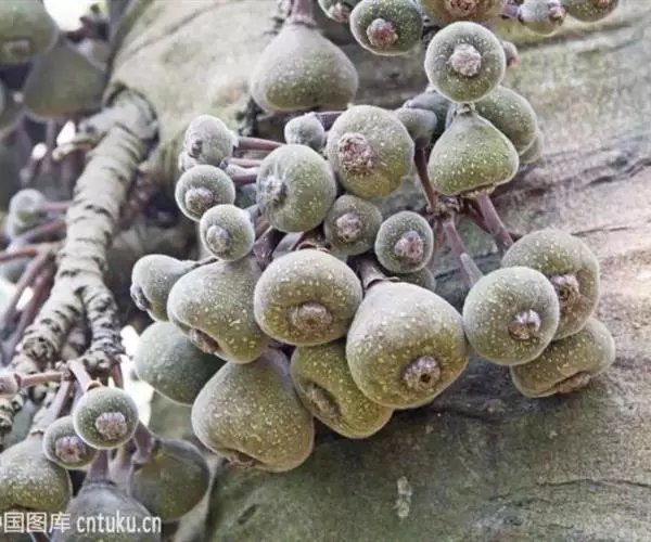 榕果簇生于树干基部或老茎短枝上,大而梨形或扁球形 至陀螺形,直径3-5 (-6)厘米,具明显的纵棱8-12条,幼时被白色短柔毛,成熟脱 落,红褐色,顶生苞片宽三角状卵形,4-5轮覆瓦状排列而成莲座状,基生苞片3枚,卵 状三角形;总梗长4-6厘米,粗壮,被柔毛;雄花,无柄,花被片3,匙形,薄膜质,透 明,雄蕊2,花药卵形,花丝长;瘿花花被片下部合生,上部3裂,微覆盖子房,花柱侧 生,被毛,柱头膨大;雌花,生于另一植株榕果内,有或无柄,花被片3裂,子房卵圆形, 花柱侧生,被毛,较瘿花花柱长。瘦果有粘液。花期8月至翌年3月,果期5-8月。