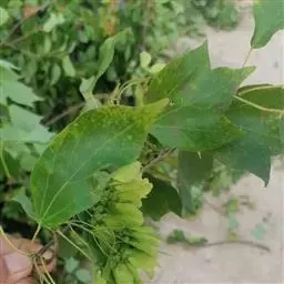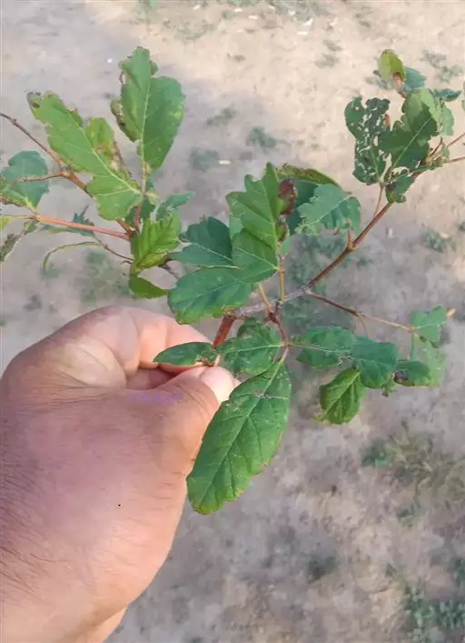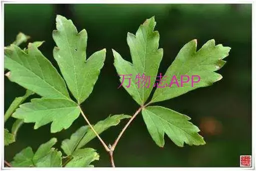 复叶有3小叶;小叶纸质,卵形,椭圆形或长圆椭圆形,长5-8厘米,宽3-5厘米,先端钝尖,边缘有2-3个钝形大锯齿,顶生的小叶片基部楔形或阔楔形,有5-8毫米的小叶柄,侧生小叶基部斜形,有长2-3毫米的小叶柄,上面绿色,嫩时有短柔毛,渐老则近于无毛;下面淡绿色,略有白粉,有淡黄色疏柔毛,叶脉上更密,主脉在上面略凹下,在下面凸起,侧脉9-11对,在上面微凹下,在下面显著;叶柄长2-4厘米,有疏柔毛,嫩时更密。