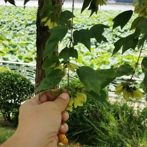 聚伞花序有长柔毛,常仅有3花;总花梗长6-8毫米;花淡黄色,杂性,雄花与两性花异株;萼片5,长圆卵形,长6毫米,宽2-3毫米;花瓣5,长圆倒卵形,长7-8毫米,宽5毫米;雄蕊10,长1-1.2厘米,花丝无毛,花药黄色;花盘位于雄蕊的外侧;子房有绒毛;花梗长10毫米。