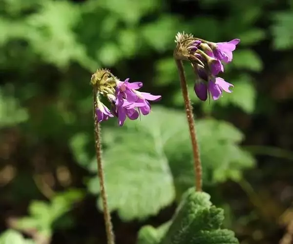 多年生草本。株高20-25厘米,有时高达40厘米。叶基生,轮廓近圆形,长3.5-8厘米,宽4-8 (9) 厘米,基部深心形,边缘掌状浅裂,裂深不超过叶片的1/4,裂片三角状半圆形,边缘具不整齐的钝圆或稍锐尖牙齿,上面深绿色,被疏柔毛或近于无毛,下面淡灰色,被柔毛;叶柄长为叶片的2-3倍,被柔毛。花葶直立,通常高出叶丛1倍,被稀疏柔毛或近于无毛;伞形花序5-8 (10) 花;苞片狭楔形,顶端有缺刻状深齿;花梗纤细,不等长;花萼长4.5-5毫米,分裂略超过中部,裂片披针形,锐尖;花冠漏斗状钟形,紫红色,长8-10厘米,分裂略超过中部,裂片长圆形,先端钝;雄蕊着生于花冠基部,花药长达3.5毫米,纵裂,先端具小尖头;花柱长达8毫米,伸出花冠外。蒴果圆筒形,长于宿存花萼。花期5-7月;果期7-8月。