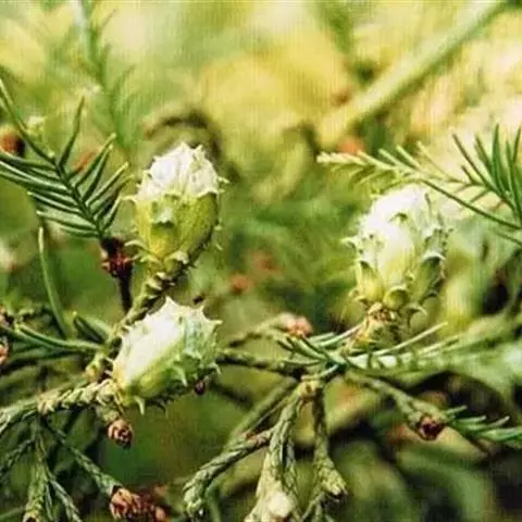 雄球花卵形,长1.5-2毫米。球果卵状椭圆形或卵圆形,长2-2.5厘米,径1.2-1.5厘米,淡红褐色;种鳞盾形,顶部有凹槽,中央有一小尖头;种子椭圆状矩圆形,长约1.5毫米,淡褐色,两侧有翅。