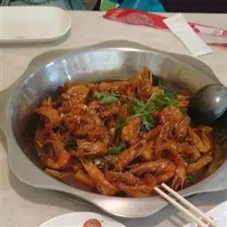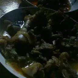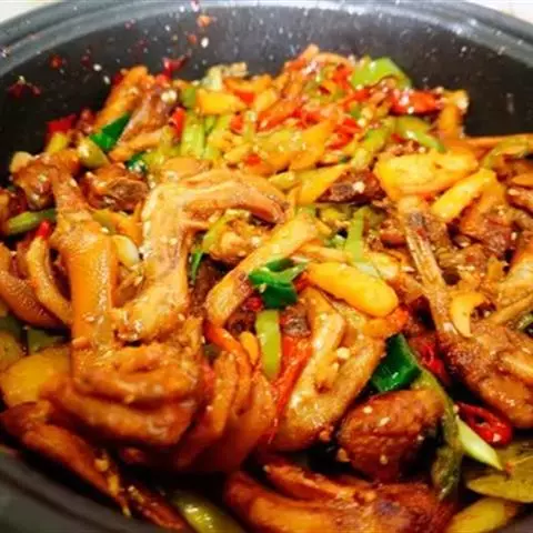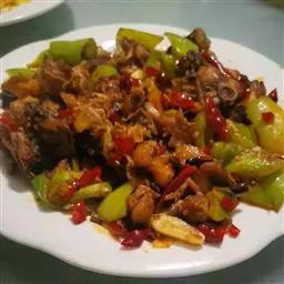 辣子鸡 3、锅留底油至热,下干辣椒炒至棕红色,下花椒炒香,倒入鸡腿,烹入料酒,簸匀加入盐、味精、胡椒、白糖、醋、烹入鲜汤炒至鸡丁回软。汁干时,下马耳朵葱簸匀起锅即成。