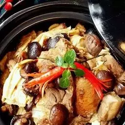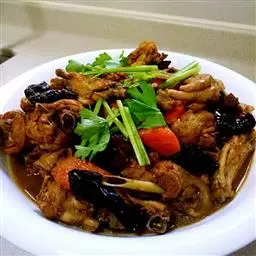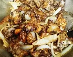 1、将鸡腿或一整只鸡洗净改成丁放入碗中用盐、料酒码味,微炸成型。