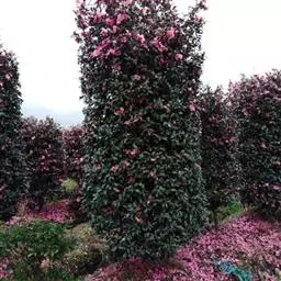 ③人工整形:山茶花还可以通过人工整形,供观赏应用,如:将山茶通过修剪整形,把树冠整成球形、伞形、圆柱形树冠,山茶墙树式,平卧铺地式,使山茶匍匐于地生长,铺地而生 。墙树在西欧北美应用较多,即将山茶花植于向阳温暖的墙面之外,附以攀登墙架,使山茶枝干顺墙面而升,继而覆盖墙面,颇为壮观。