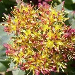 伞房状花序小,直径2.5厘米,花稍密生;苞片少数,倒卵状披针形,被短柔毛;花稍大;萼片5,线状披针形,长1.8毫米,钝,被微乳头状突起;花瓣5,黄绿色,长圆状披针形,长3.5-4毫米,宽1毫米,外面被微乳头状突起;雄蕊5,较花瓣短;鳞片5,正方形,心皮5,披针形,花柱短。花期9-10月。