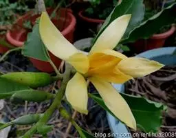 黄桷兰,又名黄兰(植物名实图考) 黄玉兰(广东),黄缅桂(云南) 图版40:1-7。是木兰科、木兰属的常绿乔木植物。黄桷兰枝干挺拔, 高达20米,幼枝、叶互生,薄革质,叶色苍翠,花单生于叶腋,橙黄色,花朵素雅,极香,香味清幽甜润,含苞欲放时香味最浓郁;花期长,温度适宜可花开不绝。有独特的生长习性。分布在云南南部和西南部,在长江以南各省区均有栽培。喜生长于温暖地方。花和叶是芳香油原料,可提取浸膏;木材优良,可供造船。分布于印度、尼泊尔、缅甸、越南。中国西藏东南部、云南、福建、台湾、广东、海南、广西有栽培;长江流域各地盆栽,在温室越冬。