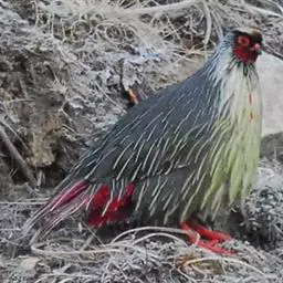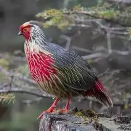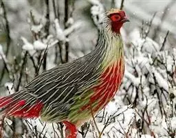 血雉雉科血雉属鸟类,别名血鸡、松花鸡,血雉的雄鸟大覆羽、尾下覆羽、尾上覆羽、脚、头侧、腊膜为红色,…