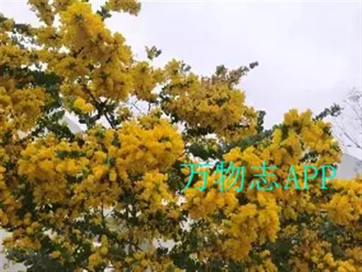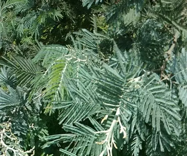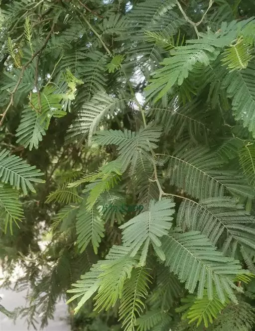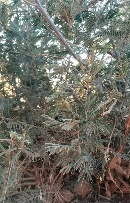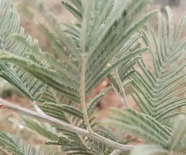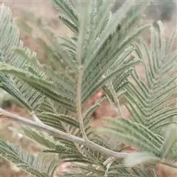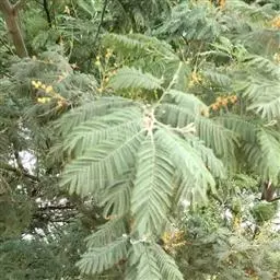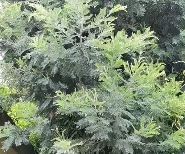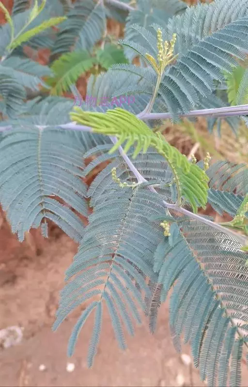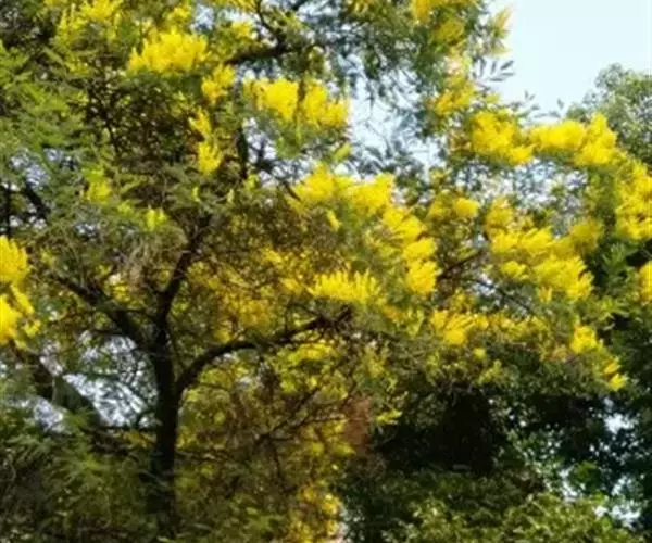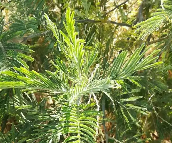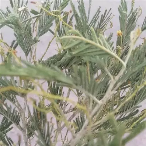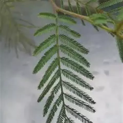 无刺灌木或小乔木,高15米;嫩枝及叶轴被灰色短绒毛,被白霜。二回羽状复叶,银灰色至淡绿色,有时在叶尚未展开时,稍呈金黄色;腺体位于叶轴上着生羽片的地方;羽片10-20(-25)对;小叶26-46对,密集,间距不超过小叶本身的宽度,线形,长2.6-3.5毫米,宽0.4-0.5毫米,下面或两面被灰白色短柔毛。