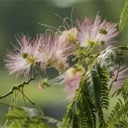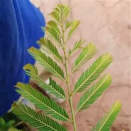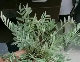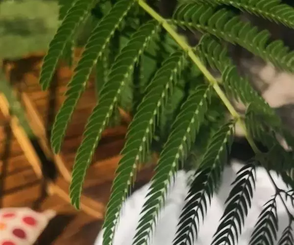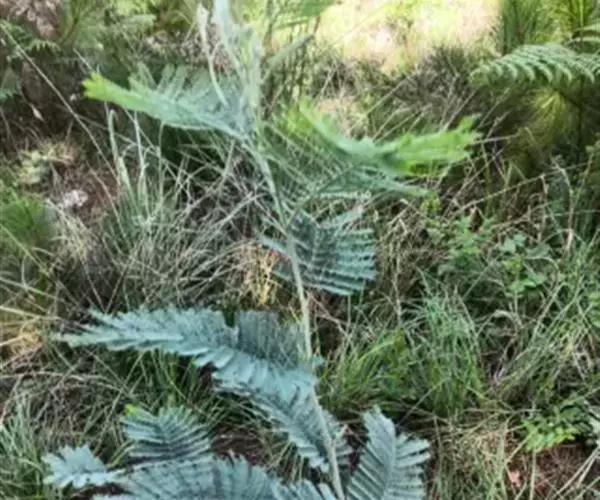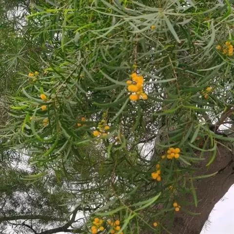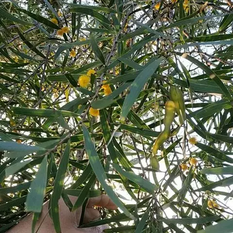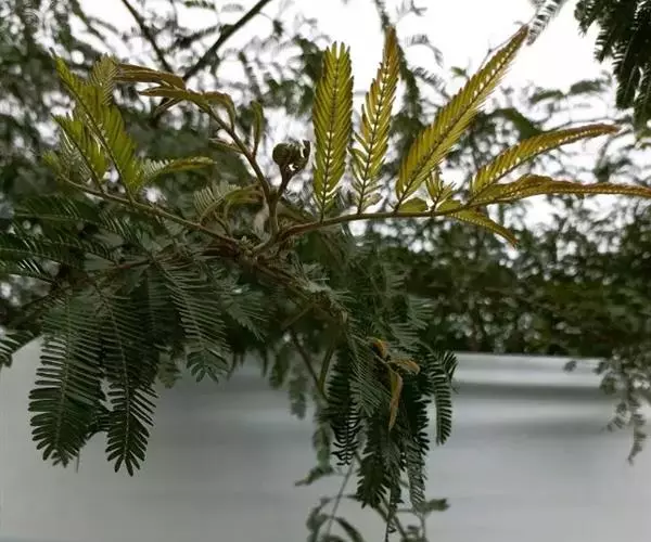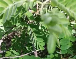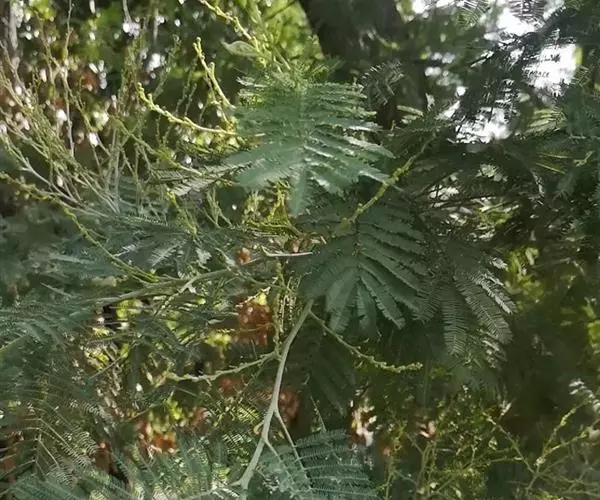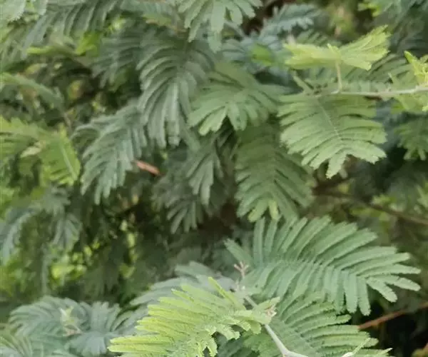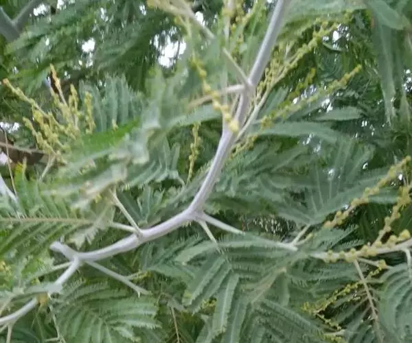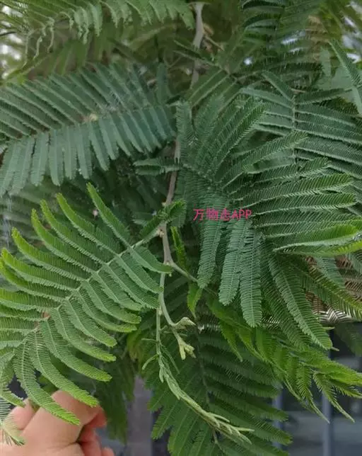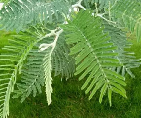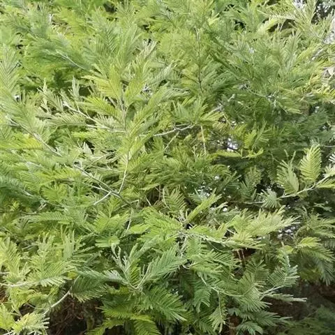 无刺灌木或小乔木,高15米;嫩枝及叶轴被灰色短绒毛,被白霜。二回羽状复叶,银灰色至淡绿色,有时在叶尚未展开时,稍呈金黄色;腺体位于叶轴上着生羽片的地方;羽片10-20(-25)对;小叶26-46对,密集,间距不超过小叶本身的宽度,线形,长2.6-3.5毫米,宽0.4-0.5毫米,下面或两面被灰白色短柔毛。