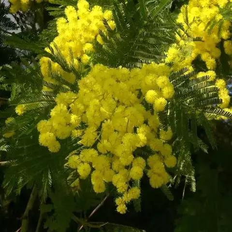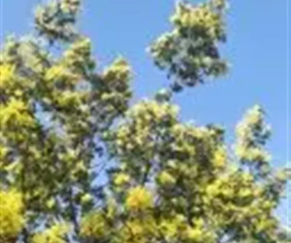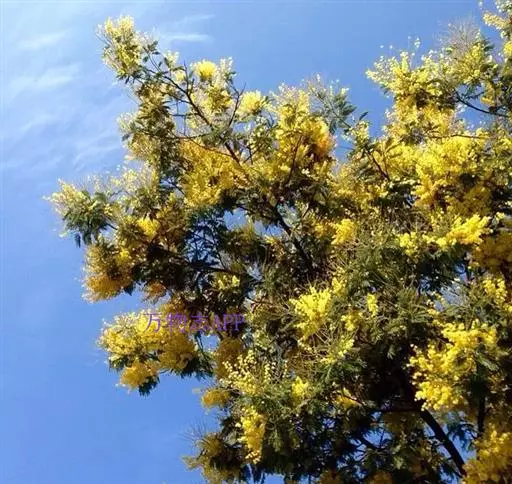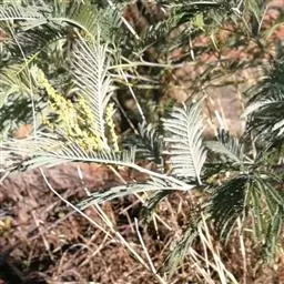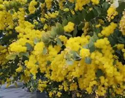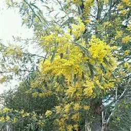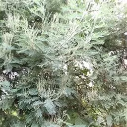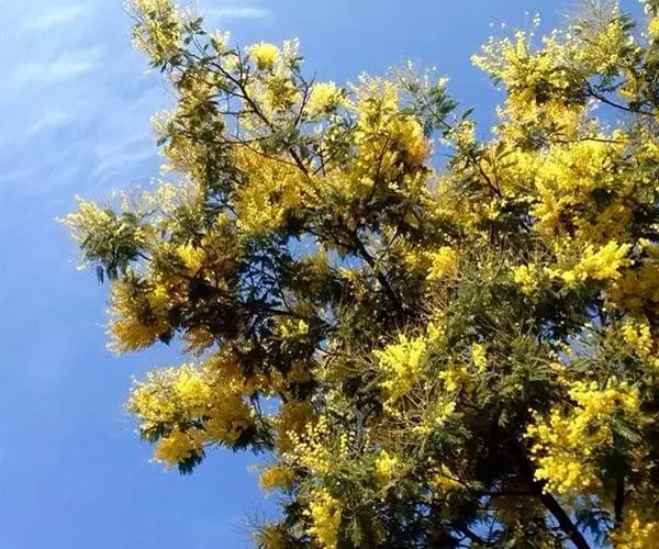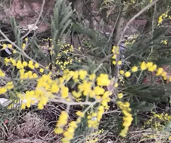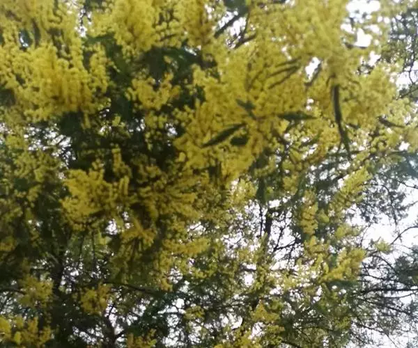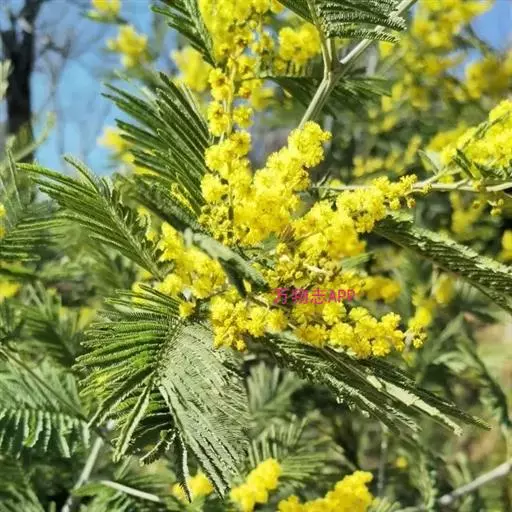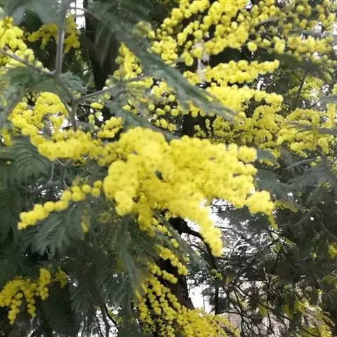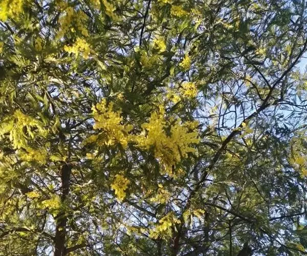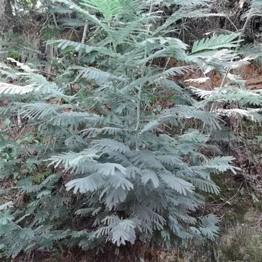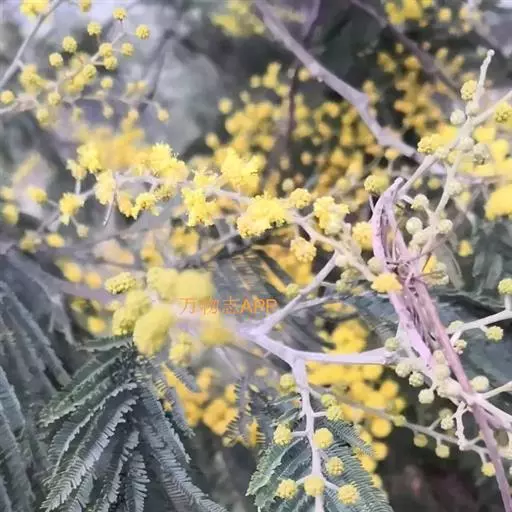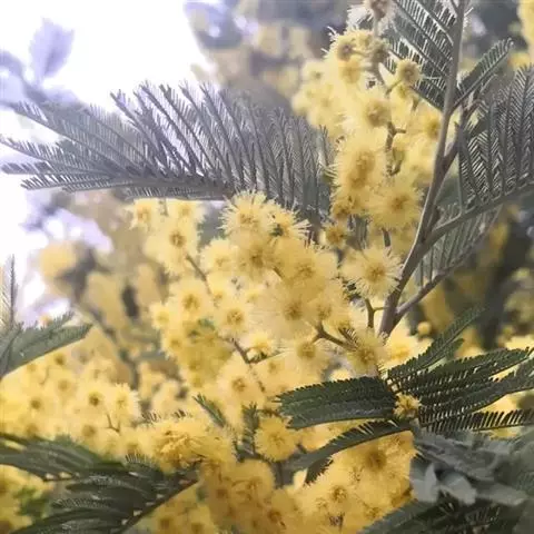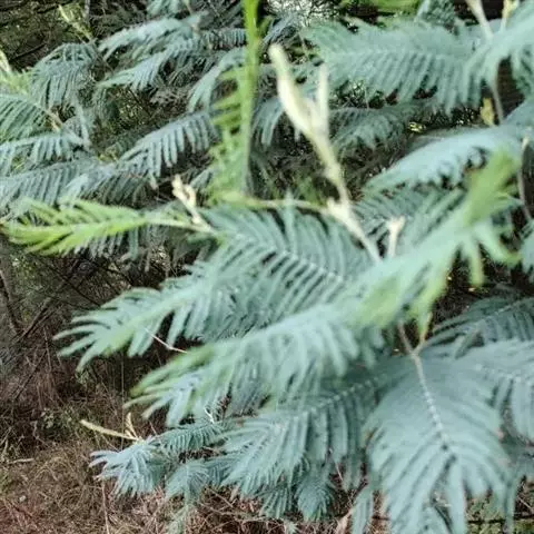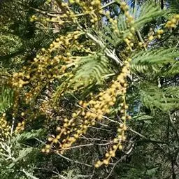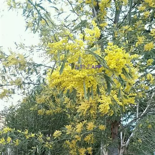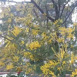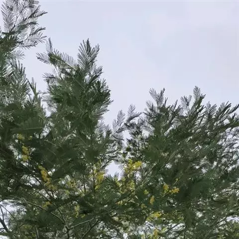 银荆(学名:Acacia dealbata Link),被子植物豆科常绿乔木,高约25米,树干较直,树皮灰绿或灰色;二回羽状复叶,偶数,小叶线形,银灰色或浅灰蓝色。3~4月开花,头状花序,具小花30-40朵,花黄色,有香气。荚果长带形,长3.5-11厘米,果皮暗褐色,密被绒毛。种子卵圆形,黑色,有光泽。