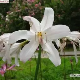 长筒石蒜草本,地生。鳞茎卵球形;叶披针形;伞形花序,有花5-7朵,花白色;花被裂片腹面稍有淡红色条纹,…