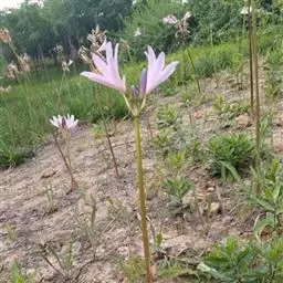鳞茎卵形,直径约5厘米。秋季出叶,长约8厘米,立即枯萎,到第二年早春再抽叶,叶带状,顶端钝圆,绿色,宽约2厘米。花茎高约60厘米;总苞片2枚,披针形,长约6厘米,宽约1.3厘米;伞形花序有花4-8朵;花淡紫红色;花被裂片倒披针形,长约7厘米,宽约1.8厘米,边缘基部微皱缩,花被筒长约2厘米;雄蕊与花被裂片近等长;花柱略伸出花被外。花期8月。