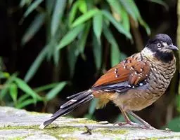 斑背噪鹛是噪眉科、噪鹛属中型鸟类,体长24-28厘米。额至头顶多为栗褐色,眼先、眼周和眼后纹均白色,…