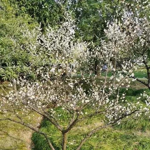 三、龙游梅类(Armeniaca mume var. tortuosa T. Y. Chen et H. H. Lu) 枝条自然扭曲如游龙;花碟形,半重瓣,白色,如龙游梅。