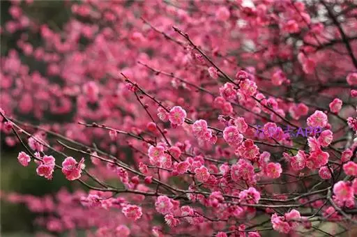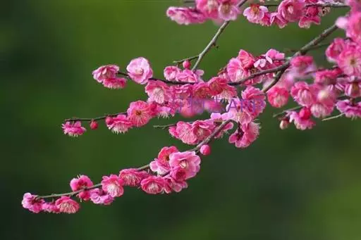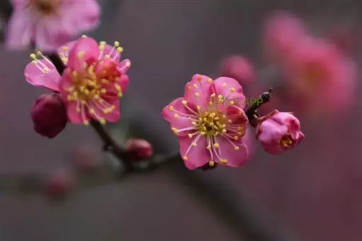 宫粉型(Armeniaca mume f.alphandii (Carr.)Rehd.) 花碟形,半重瓣至重瓣,粉红色。现知75个品种,如宫粉、粉嘴子、千叶红、南京春,粉妆台阁等。