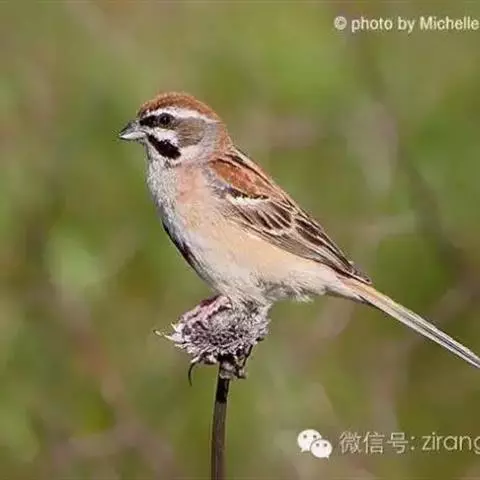 栗斑腹鹀:属小型鸣禽。体重19-25克,体长145-167毫米。头顶至背栗红色,眼先和颧纹黑褐色,…