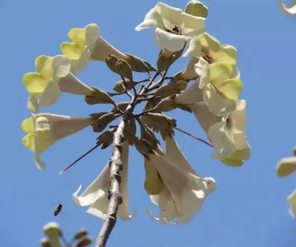 花序枝几无或仅有短侧枝,故花序狭长几成圆柱形,长约25厘米,小聚伞花序有花3-8朵,总花梗几与花梗等长,或下部者长于花梗,上部者略短于花梗;萼倒圆锥形,长2-2.5厘米,花后逐渐脱毛,分裂至1/4或1/3处,萼齿卵圆形至三角状卵圆形,至果期变为狭三角形;花冠管状漏斗形,白色仅背面稍带紫色或浅紫色,长8-12厘米,管部在基部以上不突然膨大,而逐渐向上扩大,稍稍向前曲,外面有星状毛,腹部无明显纵褶,内部密布紫色细斑块;雄蕊长3-3.5厘米,有疏腺;子房有腺,有时具星毛,花柱长约5.5厘米。