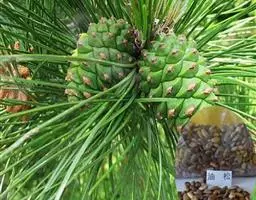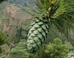 球果通常单生,初直立,后下垂,成熟前淡绿色,熟时淡黄褐色,卵圆形或圆锥状卵圆形,长5-7厘米,径4-6厘米,有短梗或几无梗;种鳞矩圆状宽楔形,先端厚,鳞盾近菱形,有横脊,鳞脐生于鳞盾的中央,明显,三角状,顶端有刺,刺之尖头向下反曲,稀尖头不明显;种子灰褐色,近倒卵圆形,长约1厘米,径5-6毫米,种翅短,赤褐色,有关节易脱落,长约5毫米;子叶9-11枚,针形,长3.1-3.7厘米,宽约1毫米,初生叶窄条形,长1.8-4厘米,宽不及1毫米,上下面均有气孔线,边缘有细锯齿。花期4-5月,球果第二年10-11月成熟。