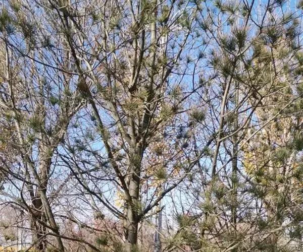 危害特征:松梢螟成虫灰褐色,幼虫淡褐色到淡绿色。松梢螟可钻蛀白皮松主梢,让松梢枯死,引发侧梢丛生。侧梢的向上生长,可能导致树干弯曲,严重者还会引起树干断裂。松梢螟幼虫在被害梢蛀道内或枝条基部伤口越冬。