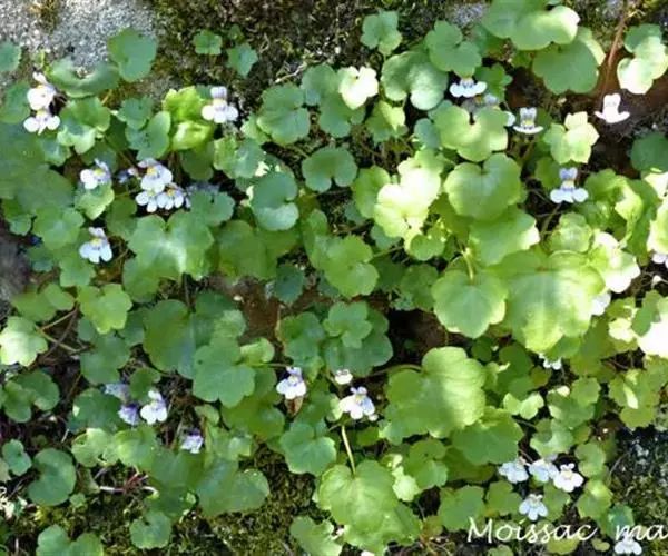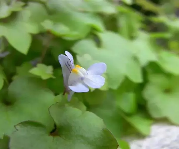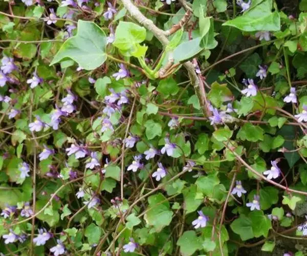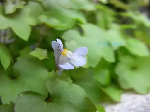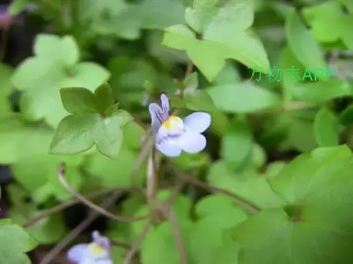 蔓柳穿鱼属(Cymbalaria muralis)蔓柳穿鱼(梅花草、小兔子花、铙钹花),蔓生多年生草 铙钹花 本。茎纤细长达60cm,下部节生细长不定根,单叶互生,叶片心脏圆形或圆肾形半圆形,长0.8~2.5cm,宽1.2~3cm,掌状5~7裂,裂片深达叶片1/3,有时侧裂片又2浅裂,裂片先端具短尖头,叶基深心形,叶柄细弱,长为叶片的2~3倍。花单生叶腋,花梗细,长1.5-2.5cm,花萼5裂,达基部,裂片披针形,长2~2.5mm;花冠蓝紫色或浅蓝色,长9~15mm,花冠筒末端有与萼片等长的短距,上唇二裂,直立,下唇3裂,中裂片隆起呈纵折,封住喉部,纵折呈黄色或白色,具腺毛,雄蕊4,2强;子房球形,花柱单一,柱头细小;种子直径1mm,球形,黑色,具瘤状突起;朔果无毛,长度超过花萼,不规则开裂。
