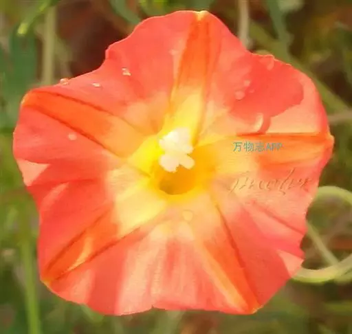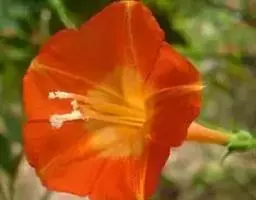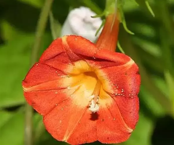 聚伞花序腋生,有花3-6朵,总花梗细弱,较叶柄长,有2苞片,花柄长约1cm,小苞片2;萼片5,不相等,卵状长圆形,钝头,有长芒尖,芒线状,长2mm,着生于萼片顶端稍下方;花冠高脚碟状,橙红色,喉部带黄色,长达8-25mm,管细长,于喉部骤然展开,冠檐5深裂;雄蕊5,显露于花冠之外,稍不等长,花丝丝状,基部肿大,有小鳞毛,花药小;雌蕊稍长于雄蕊;子房4室,每室1胚珠;花柱丝状,柱头头状,2裂。