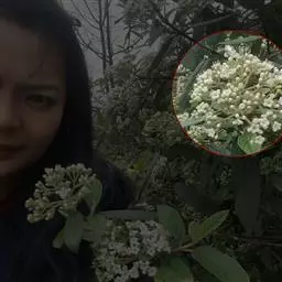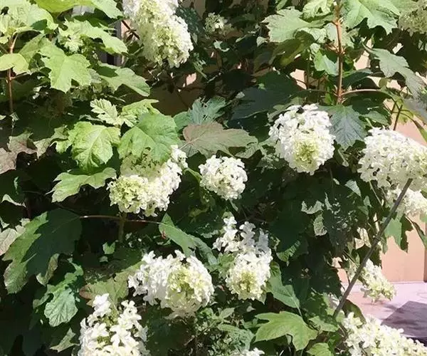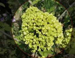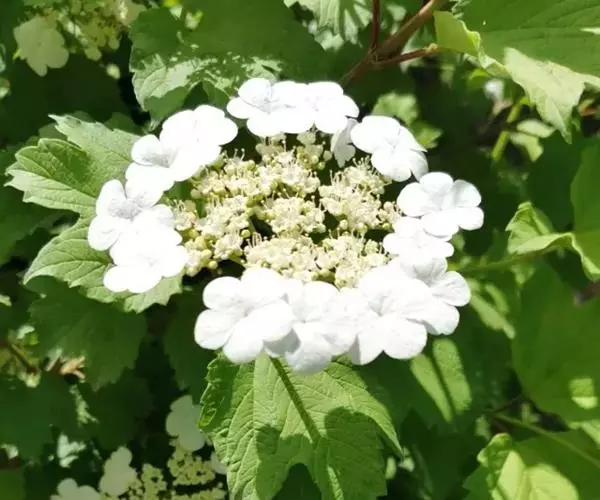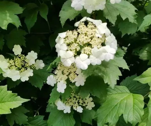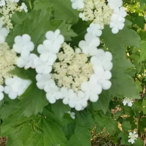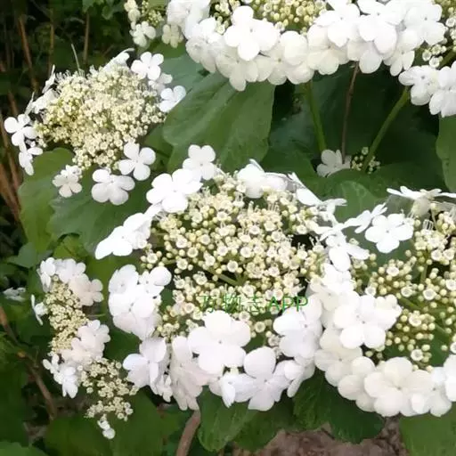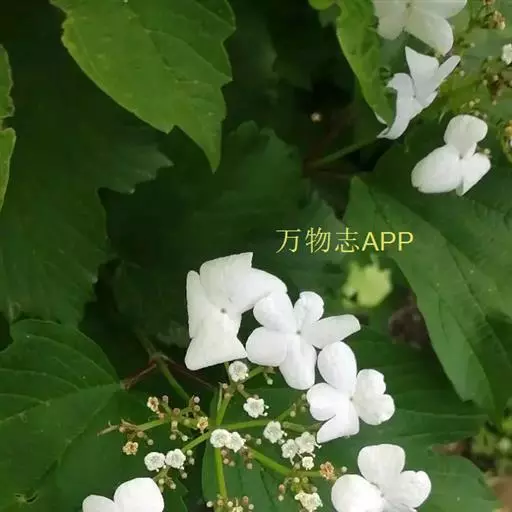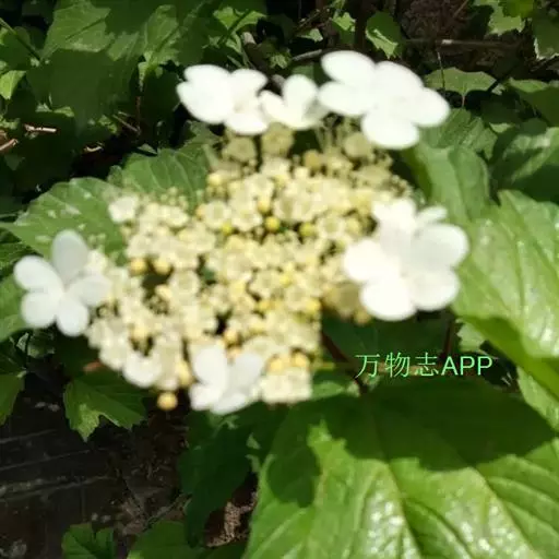 复伞形式聚伞花序直径5-10厘米,大多周围有大型的不孕花,总花梗粗壮,长2-5厘米,无毛,第一级辐射枝6-8条,通常7条,花生于第二至第三级辐射枝上,花梗极短;萼筒倒圆锥形,长约1毫米,萼齿三角形,均无毛;花冠白色,辐状,裂片近圆形,长约1毫米;大小稍不等,筒与裂片几等长,内被长柔毛;雄蕊长至少为花冠的1.5倍,花药紫红色,长不到1毫米;花柱不存,柱头2裂;不孕花白色,直径1.3-2.5厘米,有长梗,裂片宽倒卵形,顶圆形,不等形。