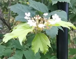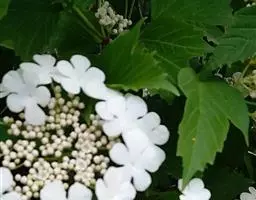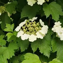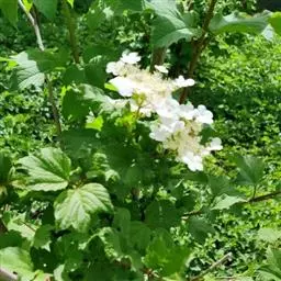 鸡树条(学名:Viburnum opulus Linn. var.calvescens (Rehd.) Hara f. calvescens)是忍冬科,荚蒾属欧洲荚蒾的原变型,落叶灌木植物。高可达4米;冬芽卵圆形,有柄,无毛,叶片轮廓圆卵形至广卵形或倒卵形,通常3裂,掌状,无毛,裂片顶端渐尖,边缘具不整齐粗牙齿,椭圆形至矩圆状披针形而不分裂,边缘疏生波状牙齿,叶柄粗壮,无毛,复伞形式聚伞花序,周围有大型的不孕花,总花梗粗壮,无毛,花生于第二至第三级辐射枝上,花梗极短;萼齿三角形,均无毛;花冠白色,辐状,花药黄白色,不孕花白色,果实红色,近圆形,5-6月开花,果熟期9-10月。