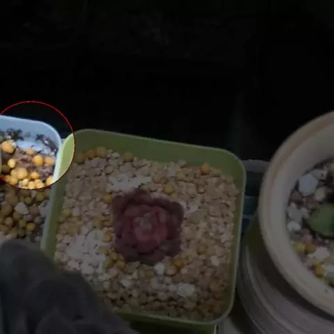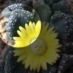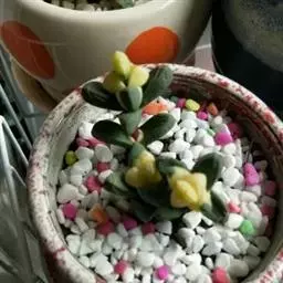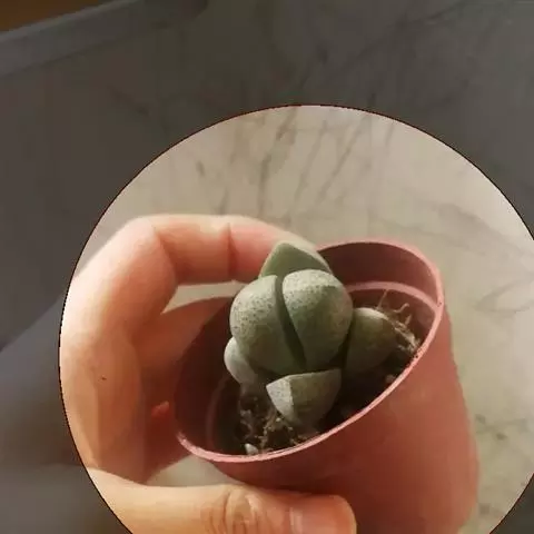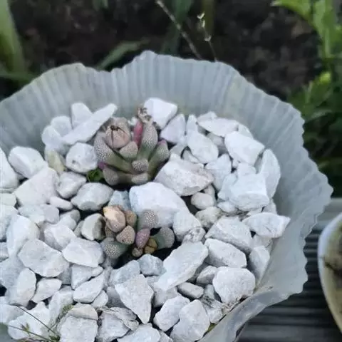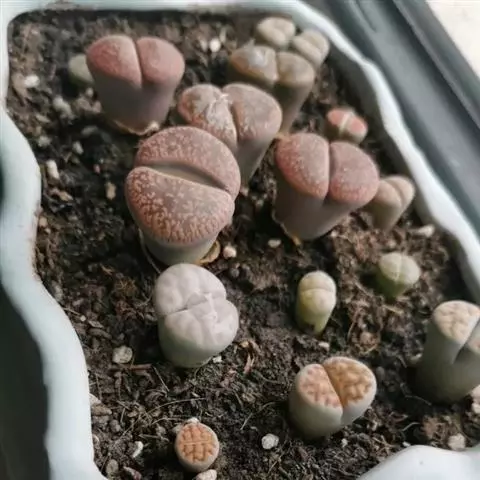 荒玉为番杏科生石花属,原产南非。株体呈白粉色,表面布满凹凸纹路,凹陷处为红褐色,每年秋季开黄花。
