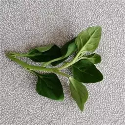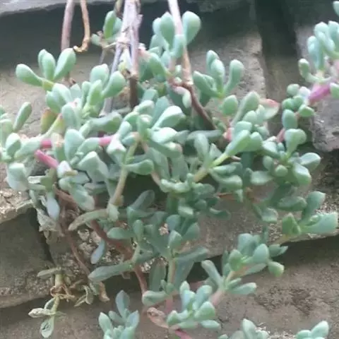 叶绿色,肉质,光线充足时呈红色,长1-2厘米,宽0.3-0.5厘米;对生,基部合生,表面覆盖极小透明玻璃状颗粒,叶先端增粗,紧靠地面的叶基部常萌发根系。