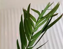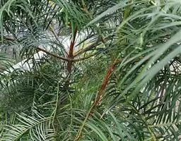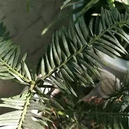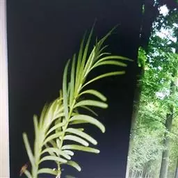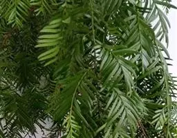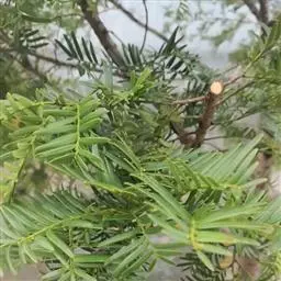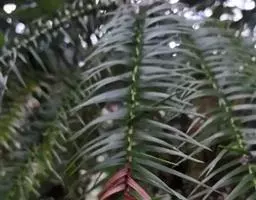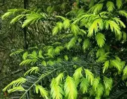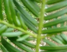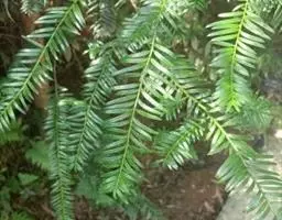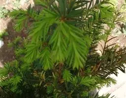 叶排成不规则的二列,斜上伸展,约成45度角,条形,通常直,稀微弯,长1-2.5厘米,宽2.5-3毫米,稀长达4厘米,基部窄,有短柄,先端通常凸尖,上面深绿色, 有光泽,下面有两条灰绿色气孔带,气孔带较绿色边带宽二倍,干后呈淡黄褐色,中脉带上无角质乳头状突起点。雄球花有雄蕊9-14枚,各具5-8个花药。