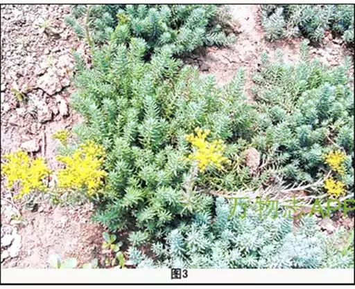 多年生草本植物株,叶带有白色蜡粉,灰绿色,叶在小枝上的排列似云杉。花亮黄色,花期 6至 7月,花枝较长且很坚硬。叶片尖端弯曲,全株灰绿色。花色黄,株高约15至25厘米。 反曲景天