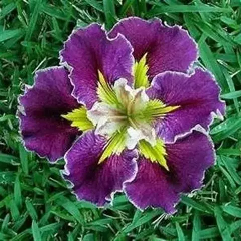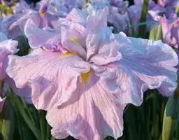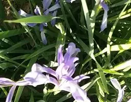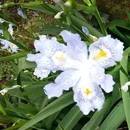粗壮小鸢尾,拟罗斯鸢尾大花变种 该变种植株的各部分均较原变种粗大;植株高20-28厘米。花期叶长约27厘米,宽约7毫米,果期叶长可达55厘米,宽约8毫米。花茎高20-28厘米;花淡蓝紫色,直径约5厘米;花梗长约1-2厘米;花被管长3-6厘米,外花被裂片长约2.6厘米,宽约9毫米,内花被裂片长2-2.2厘米,宽约7毫米;雄蕊长约7毫米;花柱分枝长约1.6厘米。花期4月,果期5-7月。产浙江。生于开阔地、林下或路旁。模式标本采自浙江西天目山。