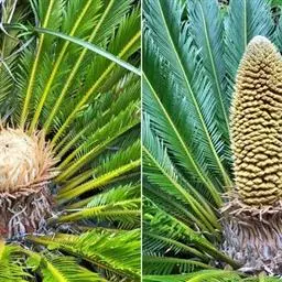 球花单性异株;雄球花卵状圆柱形,长达30厘米,直径6-8厘米,小孢子叶楔形,长2-3厘米,顶部近菱形,密被黄色绒毛,以后脱落。雌球花由多数大孢子叶组成,大孢子叶密被红褐色绒毛,裂片条形,长2-4厘米,直径1.8-2.5厘米。胚珠2-4个,着生于叶柄的两侧,无毛。种子卵圆形,长2-3厘米,直径1.8-2.5厘米,顶端有尖头,种皮硬质,平滑,有光泽。传粉3-4月,种子成熟8-10月。
