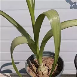 小鳞茎高2.5厘米,直径1.2-1.5厘米。茎高50-150厘米,直径1-2厘米。除基生叶外,约离茎基部25厘米处开始有茎生叶,最下面的几枚常聚集在一处,其余散生;叶纸质,具网状脉,卵状心形或卵形,先端急尖,基部近心形,长10-22厘米,宽6-16厘米,上面深绿色,下面淡绿色;叶柄长6-20厘米,基部扩大。总状花序有花3-5朵;花梗短而粗,向上斜伸,每花具一枚苞片;苞片矩圆形,长4-5.5厘米,宽1.5-1.8厘米;花狭喇叭形,乳白色或淡绿色,内具紫色条纹;花被片条状倒披针形,长13-15厘米,宽1.5-2厘米,外轮的先端急尖,内轮的先端稍钝;花丝长8-10厘米,长为花被片的2/3,花药长8-9毫米;子房圆柱形,长3-3.5厘米,宽5-7毫米;花柱长6-6.5厘米