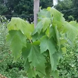 落叶乔木,高9-15米。树皮粗糙,深褐色。小枝圆柱形,无毛,当年生嫩枝淡紫绿色,直径2毫米,多年生老枝深紫色。叶薄纸质或纸质,基部深心脏形或近于心脏形,叶片的宽度大于长度,宽7-10厘米,长5.5 8厘米,通常5裂,中央裂片与侧裂片卵形或三角状卵形,长2.5-3.5厘米,近基部宽2.5-3厘米,先端短急锐尖,尖尾长8-10毫米,基部的裂片较小,边缘具紧贴的细圆齿,裂片间的凹缺锐尖,上面绿色,干后淡紫绿色,无毛,下面淡绿色,除脉腋被黄色丛毛外其余部分无毛;初生脉5条,在两面均显著;次生脉10-11对,约以80度的角与初生脉叉分,在下面较在上面显著,小叶脉仅微显著,叶柄长2-4厘米,淡紫绿色,无毛。