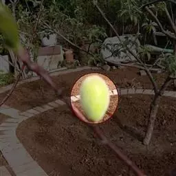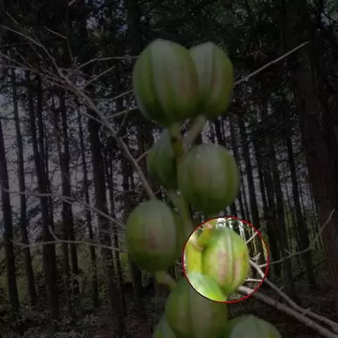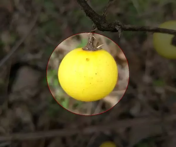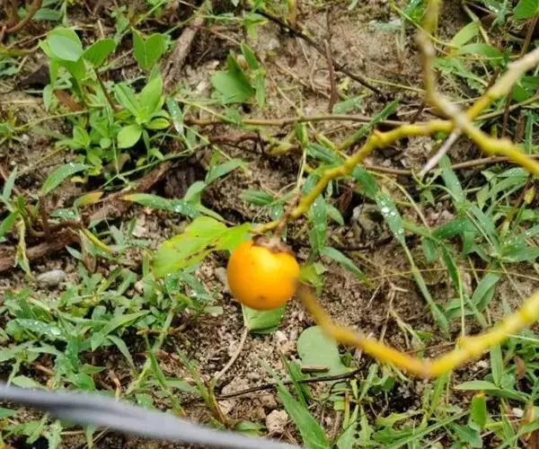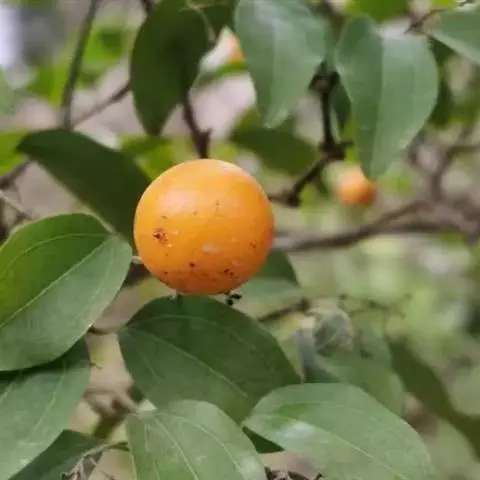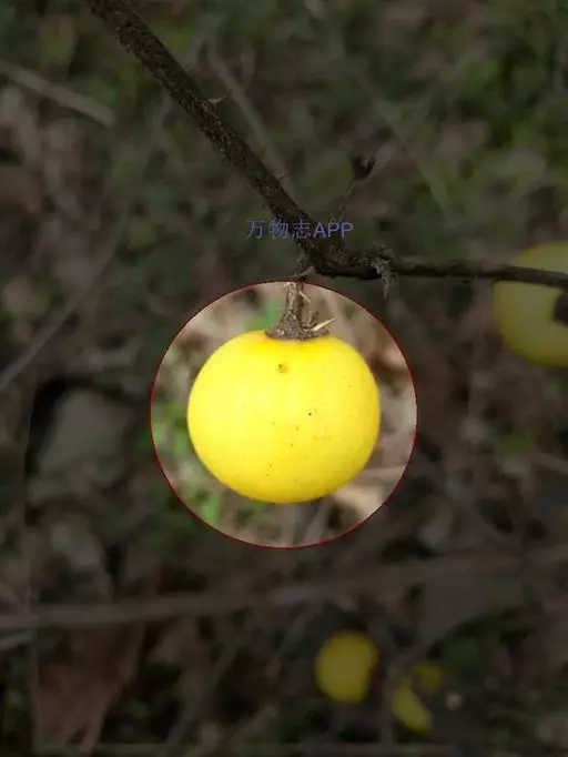 浆果扁球状,直径约3.5厘米,初绿白色,成熟后橙红色,果柄长2-2.5厘米,具细直刺;种子干后扁而薄,边缘翅状,直径约4毫米。