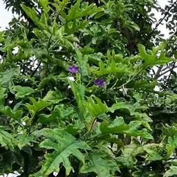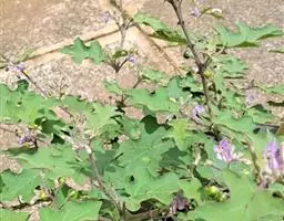 牛茄子植株 直立草本至亚灌木,高30-60厘米,也有高达1米的,植物体除茎、枝外各部均被具节的纤毛,茎及小枝具淡黄色细直刺,通常无毛或稀被极稀疏的纤毛,细直刺长约1-5毫米或更长,纤毛长约3-5毫米。叶阔卵形,长5-10.5厘米,宽4-12厘米,先端短尖至渐尖,基部心形,5-7浅裂或半裂,裂片三角形或卵形,边缘浅波状;上面深绿色,被稀疏纤毛;下面淡绿色,无毛或纤毛在脉上分布稀疏,在边缘则较密;侧脉与裂片数相等,在上面平,在下面凸出,分布于每裂片的中部,脉上均具直刺;叶柄粗壮,长2-5厘米,微具纤毛及较长大的直刺。