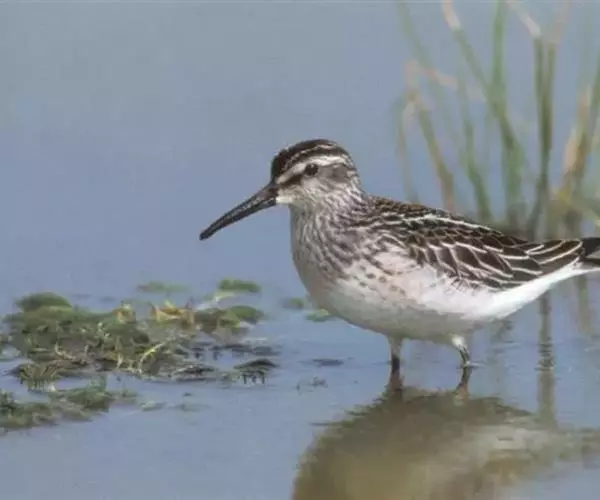 阔嘴鹬(学名:Limicola falcinellus)是涉禽,体长17厘米。特征为翼角常具明显的黑色块斑并具双眉纹。与黑腹滨鹬平滑下弯的嘴相比,阔嘴鹬的嘴具微小纽结,使其看似破裂。上体具灰褐色纵纹;下体白,胸具细纹;腰及尾的中心部位黑而两侧白。冬季与黑腹滨鹬区别在于眉纹叉开,腿短。与姬鹬易混淆,但嘴不如其直,肩部条纹不甚明显。性孤僻,喜潮湿的沿海泥滩、沙滩及沼泽地区。翻找食物时嘴垂直向下。遇警时蹲伏。繁殖于欧亚大陆北部,从斯堪的纳维亚半岛往东到西伯利亚北部,南到中亚吉尔吉斯、叶尼塞河和东西伯利亚南部。越冬于地中海、红海、印度、中南半岛和澳大利亚。