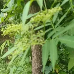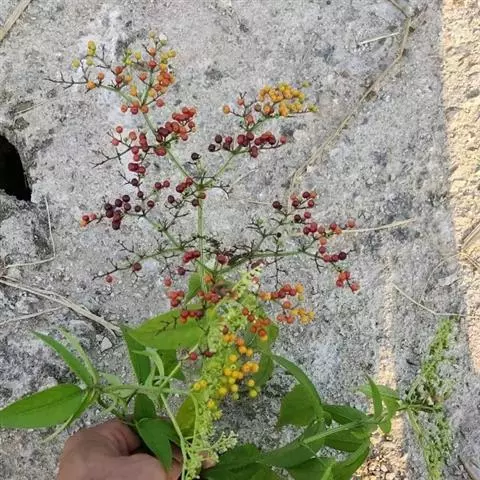 小乔木或灌木,高可达7米。新叶金黄色,老叶淡绿色,奇数羽状复叶,对生,椭圆形,长约10厘米,宽约5厘米,边缘有小的锯齿。花与叶同出,圆形聚伞状花序,顶生,长约10厘米,宽约9厘米,有花梗,花小而且密集,白色,雄蕊与花冠裂片等长,花药淡黄色,子房3室。浆果状核果,呈球形,直径约4毫米,深紫色,椭圆形。花期4-5月,果期6-8月。