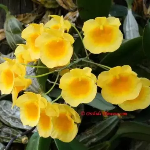 独角石斛,Dendrobium unicum,兰科石斛属植物。花瓣橙黄色,唇瓣反转似犀牛角,…