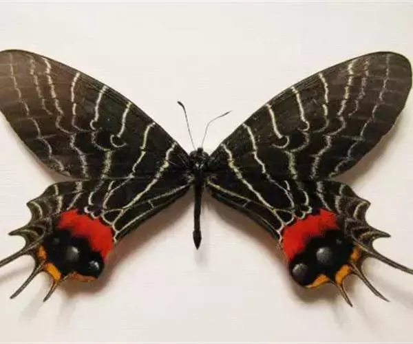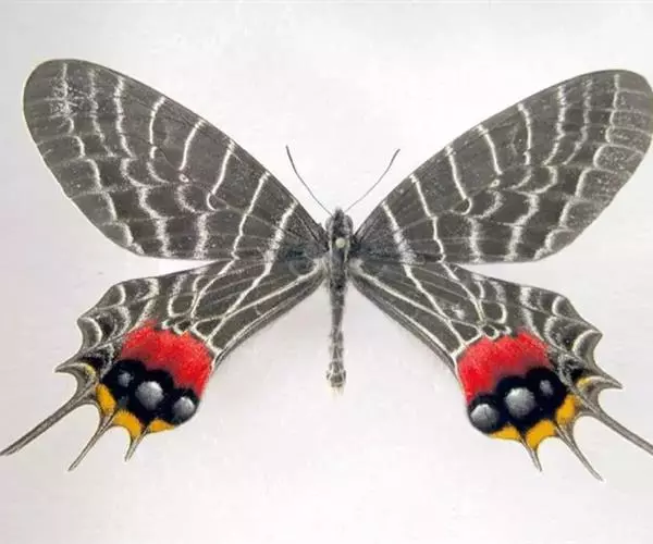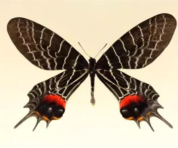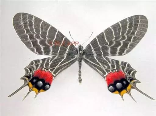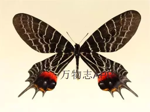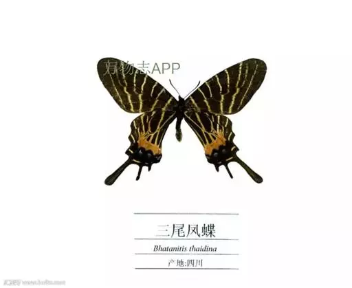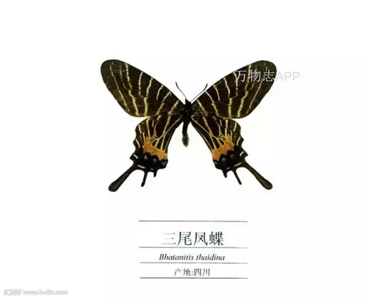 三尾褐凤蝶(学名:Bhutanitis thaidina)又名华西褐凤蝶、三尾凤蝶,凤蝶科,凤尾蝶属的昆虫,三尾褐凤蝶是中国特产蝶类,体中型,前翅长42-48毫米,后翅具尾状突起3个,故称为三尾褐凤蝶。雌雄外形一致,雌虫较雄虫略大。前翅翅表由8条自前缘至内缘的横线划为9个青铜黑色宽横带区。后翅长,外缘呈扇形。前翅翅表的浅黑色宽带呈条纹和点纹伸至后翅翅表;翅表端部有一大红斑、4个橙黄色月形斑及3个浅蓝色盘域中点。后翅有许多黄色宽线和小淡黄色斑。 寄主为木香马兜铃。