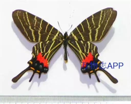 该种与双尾褐凤蝶很相似,不同的是本种前翅上半部有8条横带,双尾褐凤蝶有7条横带。该种后翅有3条尾突,无指形突;双尾褐凤蝶有2条尾突,另有1 个指状突。双尾褐凤蝶抱器腹端突呈角状,爪形突细长,阳茎细长而端部细;而该种的抱器腹端突顶端钝,爪形突较短,阳茎几乎等宽。