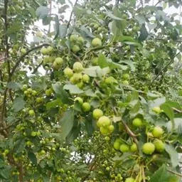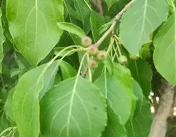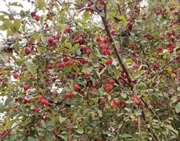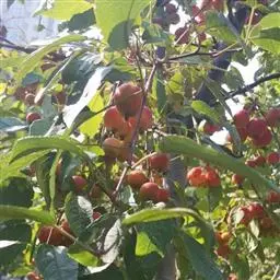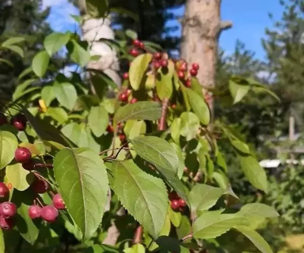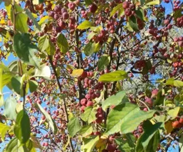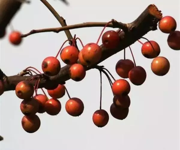 山荆子(学名:Malus baccata (L.) Borkh.):为落叶乔木,树高可达4-5米,最高可达10米以上。灰褐色,光滑,不易开裂。新梢黄褐色,无毛。嫩梢绿色微带红褐。叶片椭圆形,先端渐尖,基部楔形,叶缘锯齿细锐。伞形总状花序。花白色,花柱5或4,基部有长柔毛。4-6朵花集生在短枝顶端。6月开花,果近球形,直径0.8-1厘米,红色或黄色,脱萼,萼洼有圆形绣斑,果柄长为果实的3-4倍。果实9月中、下旬成熟,出种率4.4%。种子小,千粒重6.7克,每千克14-15万粒。