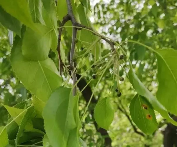 山荆子为乔木,高达10-14米,树冠广圆形,幼枝细弱,微屈曲,圆柱形,无毛,红褐色,老枝暗褐色;冬芽卵形,先端渐尖,鳞片边缘微具绒毛,红褐色。叶片椭圆形或卵形,长3-8厘米,宽2-3.5厘米,先端渐尖,稀尾状渐尖,基部楔形或圆形,边缘有细锐锯齿,嫩时稍有短柔毛或完全无毛;叶柄长2-5厘米,幼时有短柔毛及少数腺体,不久即全部脱落,无毛;托叶膜质,披针形,长约3毫米,全缘或有腺齿,早落。