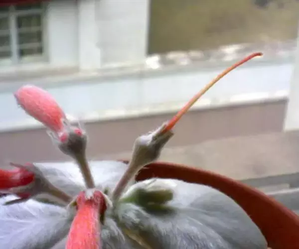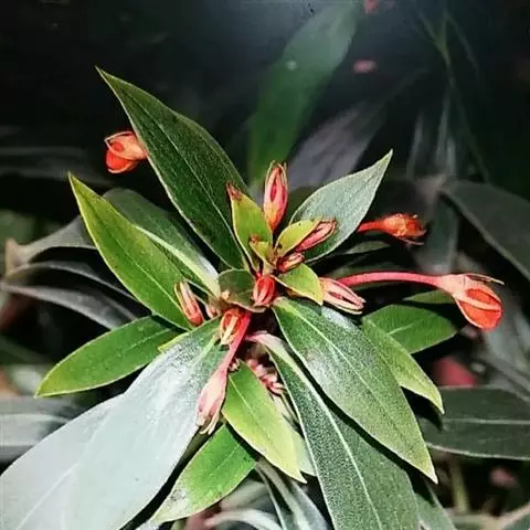 叶片生于枝条上部,椭圆形或长椭圆形,交互对生,全缘,先端尖,绿色,叶长8至12厘米,宽4至6厘米,叶表密生厚实的白色绒毛,有光泽。花生于枝顶端,数朵群聚开放,花筒较细,长3至4厘米,直径约2厘米,花瓣先端稍微弯曲,橙红色或朱红色,外被白色绒毛,春末至初秋开放,4至5月开花最盛。