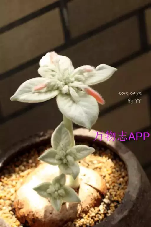 植株具球状或甘薯状肉质茎(俗称“块根”),表皮呈黄褐色,有须根,顶端簇生绿色枝条,高20-30cm,表面密生短小白毛。